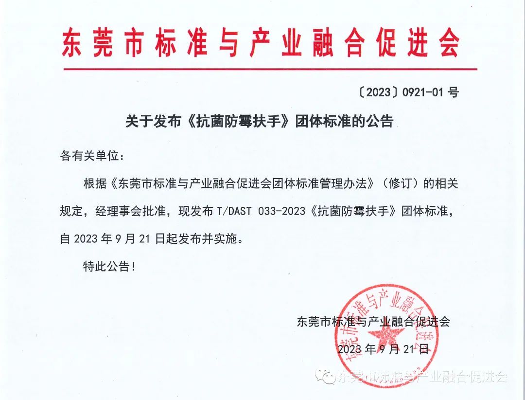 由東莞市中扶實(shí)業(yè)有限公司牽頭制定的T/DAST 033-2023《抗菌防霉扶手》團(tuán)體標(biāo)準(zhǔn),自2023年9月21日起正式發(fā)布并實(shí)施。參編單位包括中山市諾一五金制品有限公司、青島海爾益康科技有限公司、佛山東鵬潔具股份有限公司、東莞市怡美塑膠制品有限公司、廣州藍(lán)品盾建材科技有限公司、北京龍頭天威科技發(fā)展有限公司、上海潤(rùn)河納米材料科技有限公司、南德認(rèn)證檢測(cè)(中國(guó))有限公司廣州分公司等,覆蓋了塑料及金屬扶手生產(chǎn)企業(yè)、抗菌防霉劑生產(chǎn)企業(yè)、原材料供應(yīng)商、第三方檢測(cè)機(jī)構(gòu)相關(guān)領(lǐng)域。